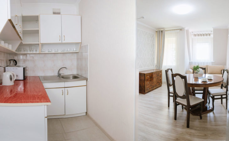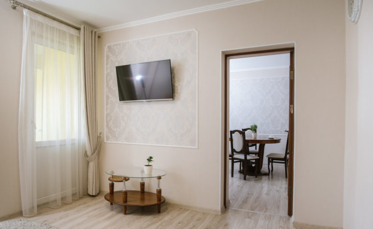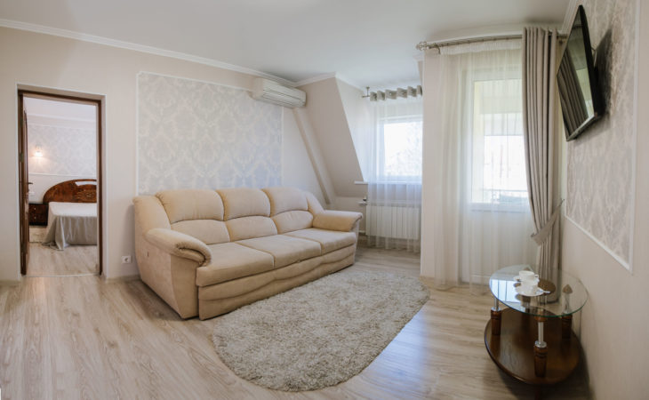 Трёхкомнатные «Апартаменты» – самый комфортабельный вариант проживания в санатории «Аркада». Площадь номера составляет 40 кв. метров, в санузле установлена ванна, имеется кухня, второй санузел и балкон. Комплект мебели и оборудования включает в себя: двуспальную кровать (1,8х2,0 м), телевизор, холодильник, раскладной диван, LED телевизор, два кондиционера, обеденный стол на 6 персон, чайник, посуда.
