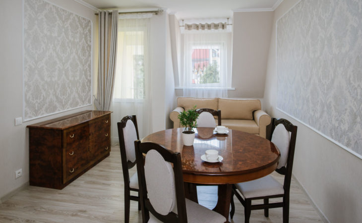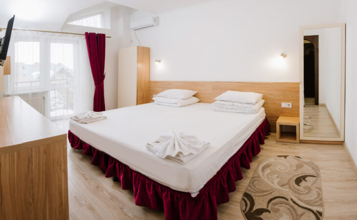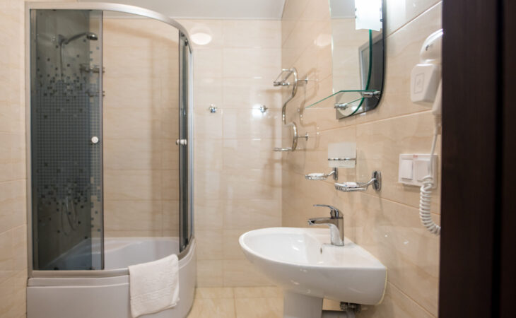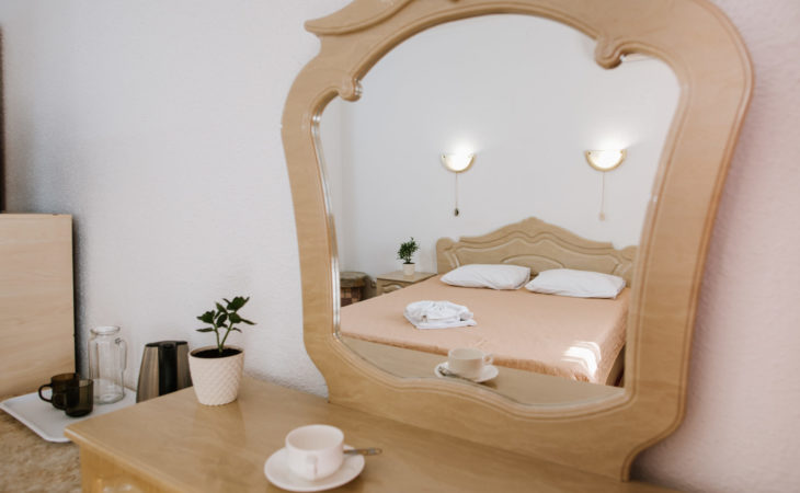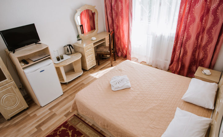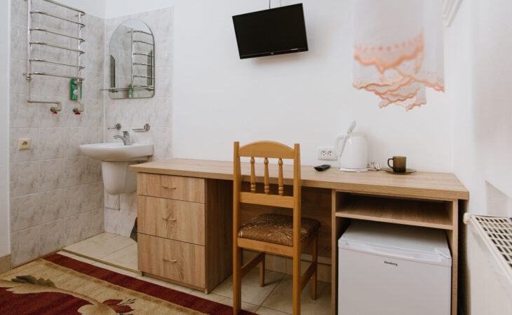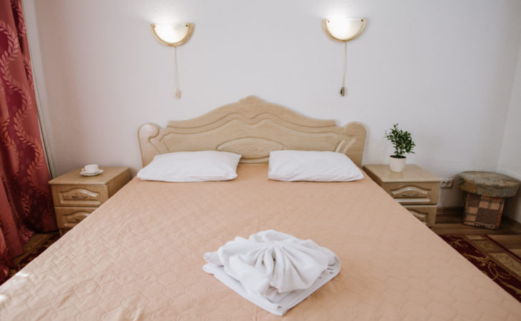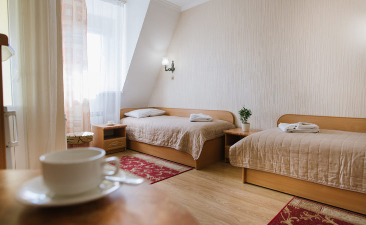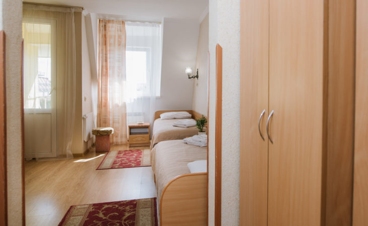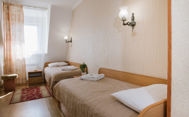 Номера категории «Двухместный стандарт» пользуется достаточно высокой популярностью, поскольку размещение в них позволяет сократить расходы, но получить все необходимое для проживания в Трускавце на время лечения и отдыха. В состав номера входят комната и санузел, в котором установлена ванна или душевая кабина. В комнате имеются две односпальные кровати и другая мебель, телевизор, холодильник, чайник, посуда.